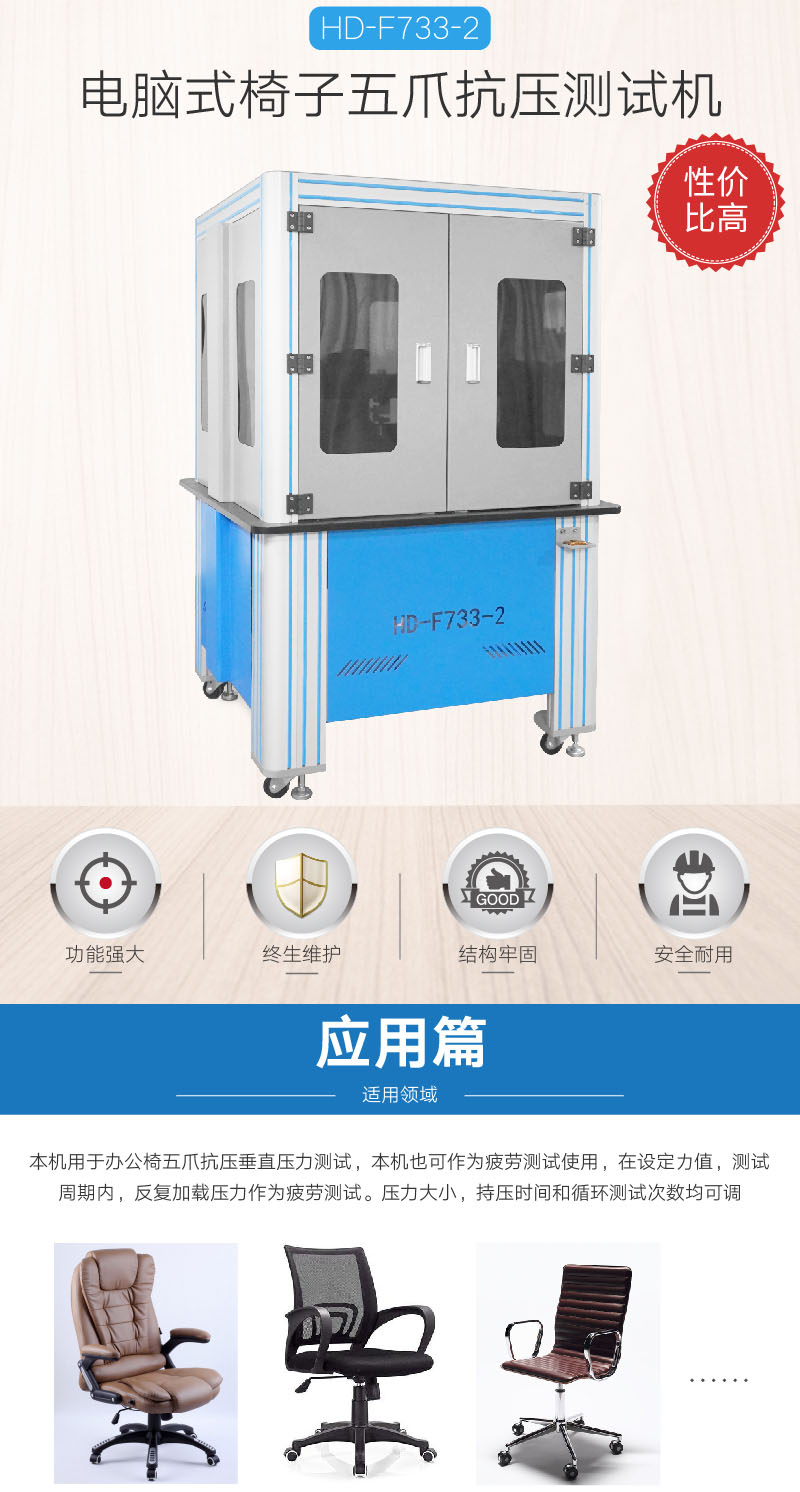 電腦式椅子五爪抗壓測試機HD-F733-2也叫“五腳靜壓試驗機”,用于辦公椅五爪抗壓垂直壓力測試,本機也可作為疲勞測試使用,在設定力值,測試周期內(nèi),反復加載壓力作為疲勞測試。壓力大小,持壓時間和循環(huán)測試次數(shù)均可調。 設計標準: 1.設計標準:GB/T16491 2.測試標準:ASTM D903,F(xiàn)2258,GB/T 2790/2791/2792, CNS-11888,JIS K6854, GB/T 6329,BS EN 14410-2003,YY/T 0729,GOST 21751,BIFMA X5.1-2011 7,QB.T2280-2007 | ||