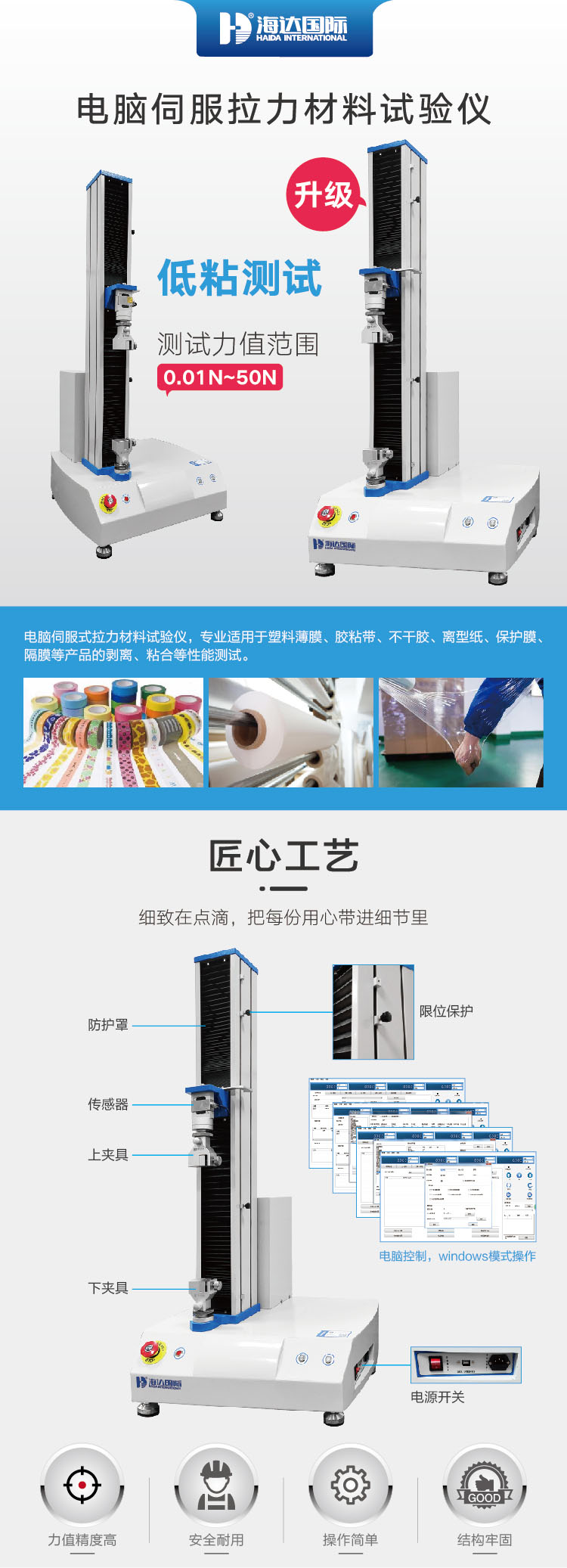 HD-B609C-S電腦伺服式拉力材料試驗機,專業(yè)適用于塑料薄膜、復合材料、軟質(zhì)包裝材料、塑料軟管、膠粘劑、膠粘帶、不干膠、醫(yī)用貼劑、醫(yī)療器械、離型紙、保護膜、組合蓋、金屬箔、隔膜、背板材料、無紡布、橡膠、紙張等產(chǎn)品的拉伸、剝離、變形、撕裂、粘合、穿刺力、開啟力、低速解卷力、拔開力等性能測試。 測試應用: HD-B609C-S擁有豐富的應用,配置了100種以上不同的試樣夾具供用戶選擇,可滿足超過1000種材料的測試要求;針對用戶材料的不同,海達還提供定制服務,滿足不同用戶的測試需求。 產(chǎn)品特點: 部件改良升級 功能結(jié)構(gòu)優(yōu)化 l 選用小容量傳感器、松下伺服電機(多功能型)和驅(qū)動器配套、睦騰行星減速機(靜音型)等優(yōu)質(zhì)部件使低黏測試數(shù)據(jù)更加準確,減小誤差 l 異響改善,達到低黏測試的要求 l 取消觸摸屏,只連接電腦,避免測試數(shù)據(jù)的干擾 l 設計手動上升下降的操作功能和標識,讓儀器更方便使用 試驗標準: TAPPI-T804、JIS-20212、GB4857.3.4、ASTM-D642、QB/T1048、BS EN ISO 12048、GB/T4857.16、GB/T8167、GB/T8168、GB/T4857.3、GB/T4857.4 | ||