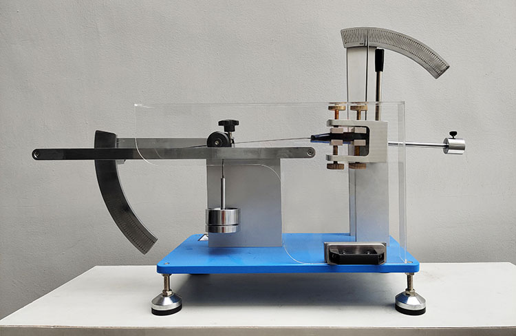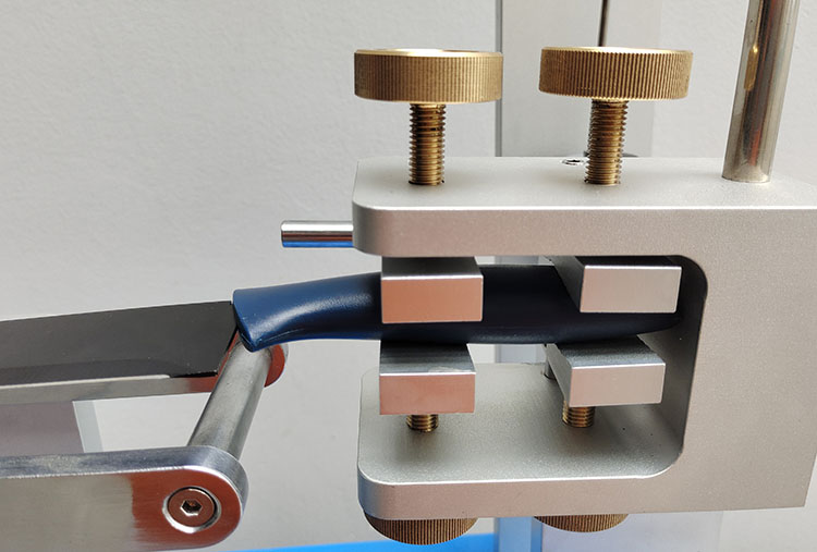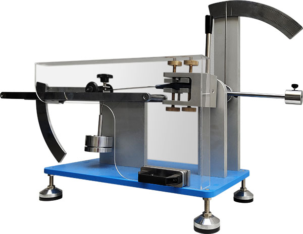 本產品可對刀具、餐具類產品如臺面用匙、飯菜叉、臺面用叉、點心刀、飯菜刀、臺面用刀等進行抗彎測試,以此評定刀具抗彎的性能。 在不掛砝碼的狀態下裝好試樣,調節左右兩邊指針至零刻度處,再對刀刃施加一定重量的砝碼,用手操縱桿轉動中心軸直至把端部夾鉗從軌道上抬起為止,并維持10S,然后把操縱桿放回,卸去負荷,從左刻度盤上讀出所偏移的角度,翻轉試件,重復試驗一次,觀察兩次試驗后試樣的損壞情況,若產生3°的永久變形,則證明樣品不合格。 設計標準:GB/T 15067.2-2016、ISO 8442-1-1997 | ||
