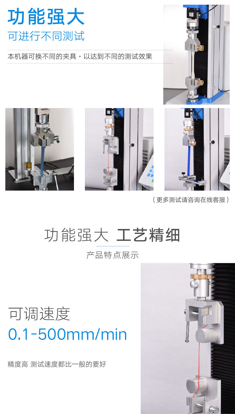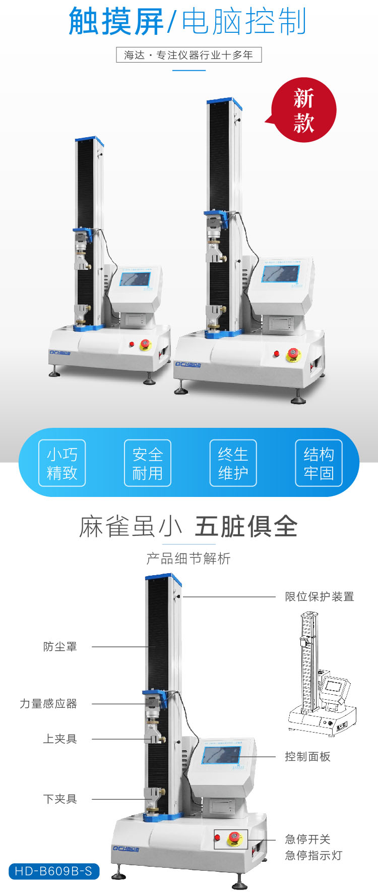 1、容量:5-200kg進(jìn)口傳感器 50-200kg 2、電機:400w松下伺服電機 r 3、驅(qū)動器:400w松下伺服驅(qū)動器 4、絲桿:進(jìn)口滾珠絲桿 5、控制方式:面板控制(LCD顯示),可連電腦,windows模式操作 6、速度: 0.1-500mm/min速度可調(diào) 7、滿載行程:900mm(含夾具) 8、荷重分解度:1/250,000 9、荷重精度:≤0.5% 10、單位切換Units:gf/kgf/N//kN/LBf/T 11、外形尺寸:(L*W*H)520*515*1250mm 12、重量:約70KG 13、電源:1∮, AC 220V, 50Hz 海達(dá)萬能拉力試驗機型號用途對比以下萬能材料試驗機可進(jìn)行:抗拉強度、抗壓強度及伸長量,可做剝離、撕裂、抗彎、抗折、壓縮等試驗。適用:膠帶、標(biāo)簽、膠黏劑、保護(hù)膜、鍍層、金屬、電子、電線電纜、防水卷材、PCB材料、鋁合金、編織袋、塑料、橡膠、無紡布、安全帶等很多行業(yè)材料。型號款式特點容量1kg=9.8N測試功能適用材料HD-B602單柱電子式,經(jīng)濟型200kg拉伸、壓縮、彎曲、撕裂、延伸率、剝離、剪切、粘接力、高粘剝離測試端子拉力、塑料件拉伸、密封圈……HD-B609單柱電腦式 雙顯200kg薄膜、塑料、離型紙/膜、膠帶、紙張、復(fù)合帶、打包帶、鋁箔、保護(hù)膜、鋁塑板……HD-B609B-S單柱電腦伺服式200kg薄膜、離型紙/膜、膠帶、紙張、復(fù)合帶、打包帶、鋁箔、保護(hù)膜、鋁塑板、鏡片(抗壓)、吸波材料(抗壓)……HD-B617 單柱電腦式雙顯500kg線束、端子、橡膠、塑料……HD-B617-S單柱電腦伺服式500kg線束、端子、橡膠、塑料……HD-B603雙柱 門式電腦式2T拉斷、拉伸、抗壓、三點抗彎、四點抗彎曲測試 、撕裂、剪切等 電線電纜、木材、某些金屬、塑料、打包帶、背包、塑料桶(抗壓)、焊接點、安全帶(拉伸)、防水卷材(拉伸)……HD-B604-S雙柱門式電腦伺服式2T電線電纜、橡膠、鏈輪、PVC手套、木材、打包帶、某些金屬、焊接點、木地板鎖扣 ……HD-B604B-S雙柱門式電腦伺服式2T電線電纜、橡膠、鏈輪、PVC手套、木材、打包帶、某些金屬、焊接點、木地板鎖扣、安全帶(拉伸)、防水卷材(拉伸)……HD-B615-S雙柱門式電腦伺服式5T金屬、鋼絲、鋼絲繩……HD-B612-S雙柱門式電腦伺服式10T~30T拉伸、壓縮、彎曲、粘合、剪切、環(huán)剛度、彈簧拉壓金屬板材、鋼絲、鋼管、鋼板、鋼筋……HD-B616雙柱門式油缸下置式30T/60T/ 100T抗拉、抗壓、屈服強度等金屬板材、鋼絲、鋼管、鋼板、鋼筋……HD-B607-S雙柱門式高低溫環(huán)境 電腦伺服式3T高低溫、抗拉、抗壓等塑料、橡膠……夾具提示:200多款不同夾具,具體需依據(jù)客戶具體測試樣品選型。備注:以上參數(shù)僅供參考,為對客戶負(fù)責(zé),具體材料選型請以銷售溝通后為準(zhǔn)。 | ||