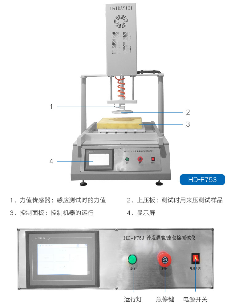 沙發彈簧測試儀用于測試沙發及家具坐墊的彈簧框架及彈簧包和彈簧坐墊的耐久性和承受力。可按預設定之壓力條件進行重復按壓測試,周期可預設定,到數自動停止。 | ||