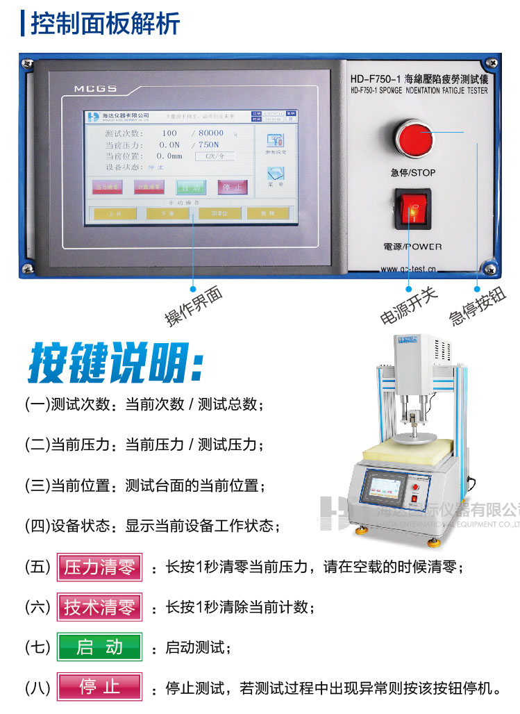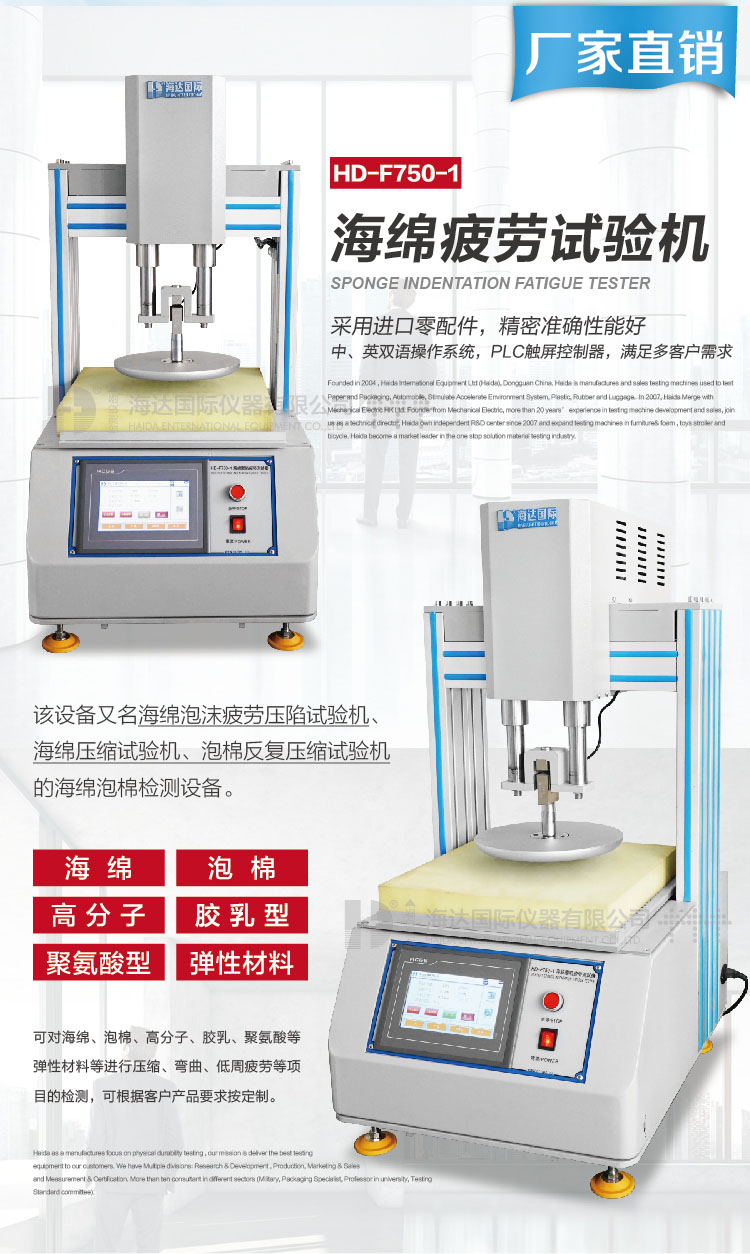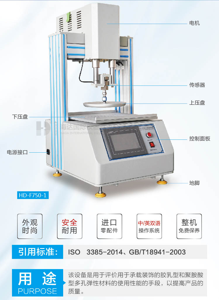 1) 試件:適用海綿尺度:0~400x400x100(L x W x H) 2) 控制方式:7寸觸摸屏+匯川PLC 3) 電氣連接:單相 AC220V/50HZ功率: 400W 4) 標準配件:上壓盤直徑(250 mm± 1 mm)一個、下壓盤:孔的直徑6mm, 間距20mm 5) 尺寸:整體600x500x1000(L x W x H) 6) 重量:500KG | ||