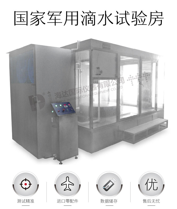 滴水試驗房適用于考核電工產品,外殼和密封在淋雨環境下能否保證設備和元件良好性能的試驗。本產品采用科學設計,使得該設備能夠逼真的模擬滴水環境。 設計標準:IP GJB150.8A-2009 標準之程序III | ||