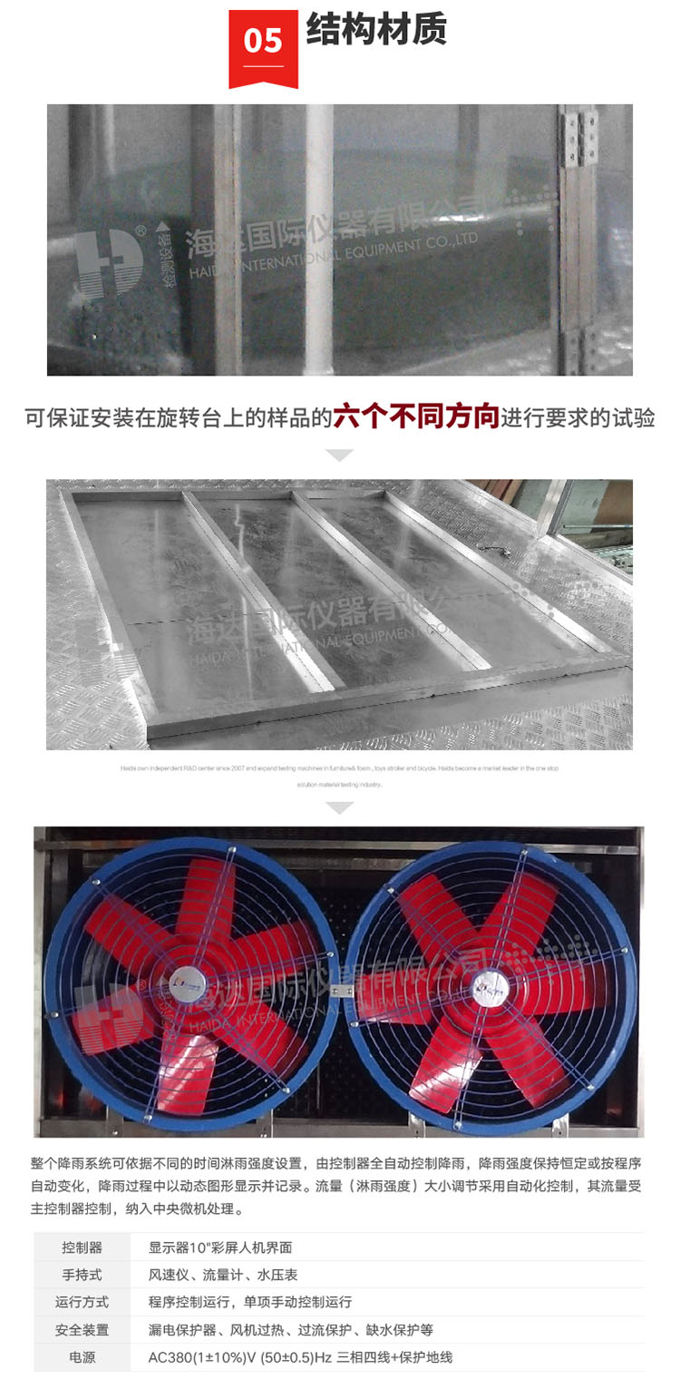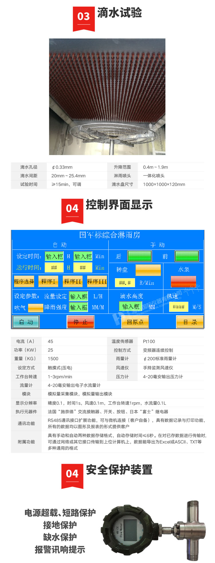 1、內箱尺寸(mm):2500×1500×2800(深×寬×高) 外型尺寸(mm)3800X 1600X3500(深×寬×高) 2、試驗臺轉速(rpm):1 ~3可調 3、滴水箱(mm): (1)1000X1000MM 孔距20X20Mm,孔徑:0.6Mm 4.、滴水箱與被測樣品的距離:1000MM 5、滴水孔直徑(mm):φ0 .4 (水滴直徑0.5-4.5MM) 6、噴水孔徑間距(mm):20 MM 7、試驗時間:1-999,999min(可設定) 10、樣品溫度:高于常溫水10° 11、箱體采用方通做骨架,彩鋼板作為封板。 12、配有適中的樣品架(放樣品用)轉速可調,正方型:1000X1000MM 13、滴水試驗機降水量:1.7mm/min 14、控制系統:公司自主研發的Teelong控制系統。 滴水試驗房滴水要求 ① 雨滴直徑范圍:0.5~4.5mm ; ② 雨滴均勻降落,使試驗臺面上樣品所有向上的表面在試驗期間能同時經受到雨滴; ③ 具備從高1m處勻速降落的雨水且試驗持續時間大于15min的試驗能力; ④ 噴嘴為方格噴霧點陣或其它交錯的點陣; ⑤ 滴水箱采用真空設計,配以氧化合金鋁及高防銹不銹鋼材質構造,噴咀接觸位不銹鋼錐形設計,方便及時安裝及更換針咀; ⑥ 直流電動升降馬達驅動,不銹鋼絲桿、滑輪導軌輔以鎖緊螺母升降裝置; ⑦ 鋁合金和不銹鋼機身; ⑧ 水箱邊框:工業合金鋁(表面氧化); ⑨ 水箱板:水箱采用USU304#不銹 (其中下封板有安裝針座的螺紋孔); ⑩ 水箱升降導軌:成型導軌、膠質滑輪導輪; ? 滴水孔徑:¢0.6mm和0.33Mm; ? 孔 距:20mm; ? 降雨量:1.7mm/min,用戶自設定參數( 誤差:+0.2mm/min); ? 試驗時間:0-999min (可設定及中間控制)。 結構材質 1. 可保證安裝在旋轉臺上的樣品的四個不同方向進行 要求的試驗; 2. 承載≥100Kg、安裝樣品的面積≥φ1200; 3. 轉速范圍:1~5rpm/min連續可調,可設定自動工作; 4. 試件尺寸空間:600mm×600mm×1800mm; 5. 淋雨板尺寸:W1000×D1000×H120mm; 6. 滴雨試驗室內部尺寸:W2500×D1500×H2800mm; 7. 外部尺寸:W3800×D1600×H2700mm; 8. 材料:靜電噴塑薄板外殼 9. 內體:304#; 10. 滴水盤:304#; 11. 旋轉臺面:304#; 12. 支架型材:304#; 13. 工作室門:平拉門,帶鋼化玻璃觀察窗; 14. 風機葉輪:鋁合金噴塑材料; 15. 風機:軸流風機; 16. 控制器:顯示器 7"彩屏人機界面; 17. 運行方式:程序控制運行;單項手動控制運行; 18. 設定方式:觸摸式(壓電); 19. 設定精度:時間:1秒,風速1米/秒; 20. 工作臺轉速:1rpm/min; 21. 控制方式:PLC、步進電機等控制; 22. 電源:AC380(1±10%)V (50±0.5)Hz 三相四線+保護地線; 23. 電源電流(A) 45 、功率(KW) 25 、重量(kg) 1500; 24. 保護裝置:漏電保護器、風機過熱、過流保護、缺水保護等。 保護裝置 1、電源超載、短路保護 2、接地保護 3、缺水保護 4、報警訊響提示 | ||