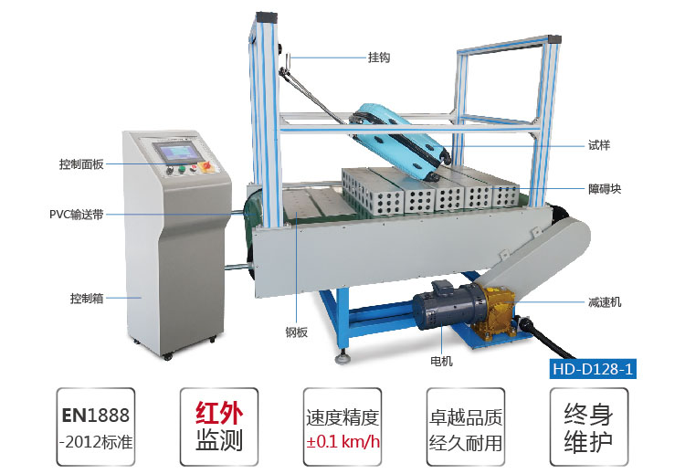 1.控制方式:彩色觸摸屏(方便實用),人機界面操作方式 2.測試速度:0-3km/h (可調) 3.試驗次數:0-9999次 4.階梯高度:高15cm 三塊 5.階梯路面寬12*0.3cm 兩塊 6.拉桿測試高度調節:手輪快速調節 7.輔助功能:中途試件掉落,感應到會自動停機 8.電源:AC220V 50HZ | ||