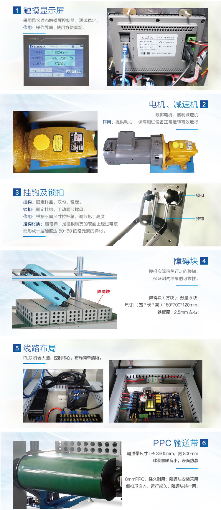 箱包輪子下樓梯試驗機專門模擬旅行箱在日常生活中常常遇到的行走路況,包括上下樓梯,以及戶外的水泥階梯,提供此測試機主要是測試輪子的綜合性能,了解產品的適應能力,做到產品的控制以及預防。 | ||