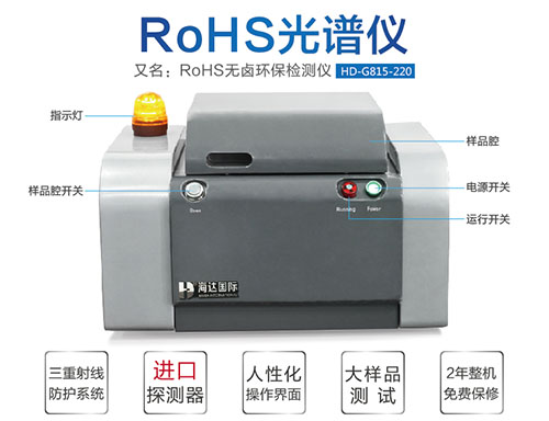 HD-Ux-220 RoHS測試儀具有三重射線防護系統;人性化操作界面;綜合應用經驗系數法、基本參數法V8.0分析軟件。元素測試范圍從Na-U。即可以管控RoHS指令的Pb、Cd、Hg、PBB和PBDE中的Br、六價鉻的Cr和無鹵指令中的Cl和Br元素。可完全滿足RoHS/WEEE/無鹵相關管控要求。精心設計的開放式工作曲線功能,特別適用于多材料的工廠制程控制。