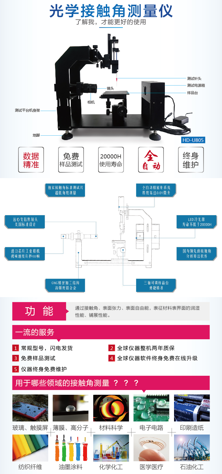 水滴角測試儀用于測試液體對固體的接觸角,即通過測量液體與固體間所形成接觸角的大小,判斷液體對固體的浸潤性。廣泛應用于硅晶、液晶、玻璃、纖維、合成材料、油墨、涂料、農藥等領域的測試與研究。 |