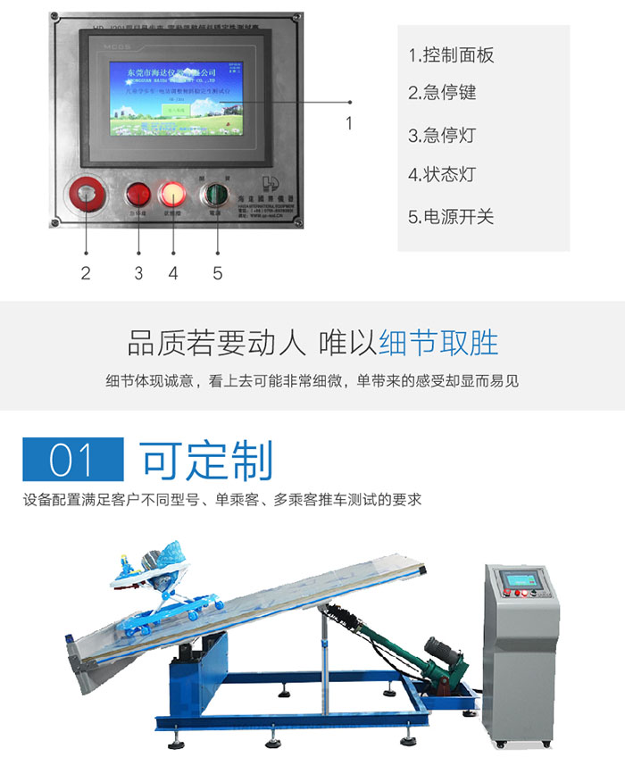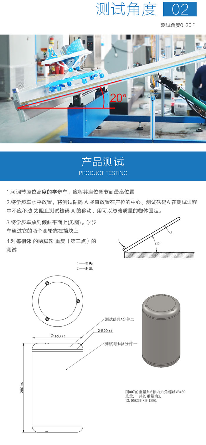嬰兒車穩定性測試性測試平臺通過穩定性模擬測試,判斷嬰兒車臺穩定性(車臺不得翻覆.測試時,任何提籃或座椅的附屬部件都不得與車架分離. | ||