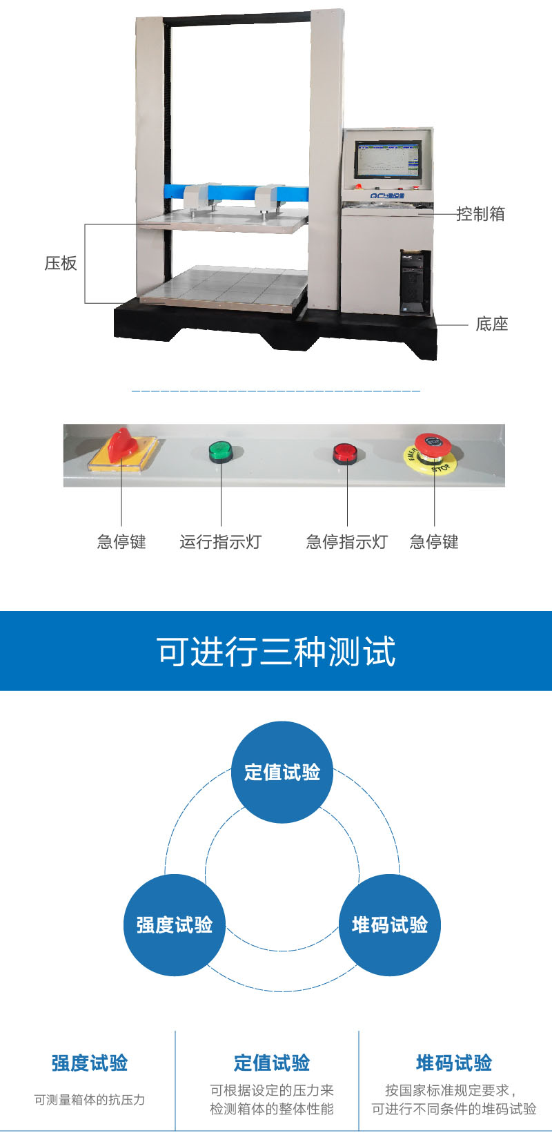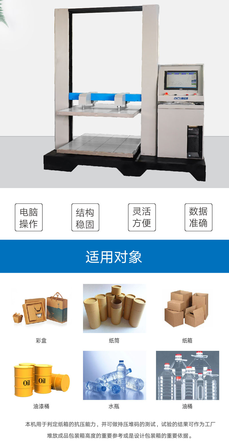 計算機伺服紙箱抗壓試驗機HD-A505S-1500是檢驗紙箱或其它包裝容器耐壓強度直接的測試儀器,用于判定紙箱的抗壓能力,并可做持壓堆碼的測試,試驗的結果可作為工廠堆放成品包裝箱高度的重要參考或是設計包裝箱的重要依據。適用于瓦楞紙箱、蜂窩板箱等包裝件的耐壓、形變、堆碼試驗。并兼顧塑料桶(食用油、礦泉水)、紙桶、紙盒、紙罐、集裝容器桶(IBC桶)等容器的抗壓試驗。 設計標準:TAPPI-T804,JIS-20212,GB4857.3.4, ASTM-D642, QB/T1048, BS EN ISO 12048, GB/T4857.16, GB/T8167, GB/T8168, GB/T4857.3,GB/T4857.4 | ||