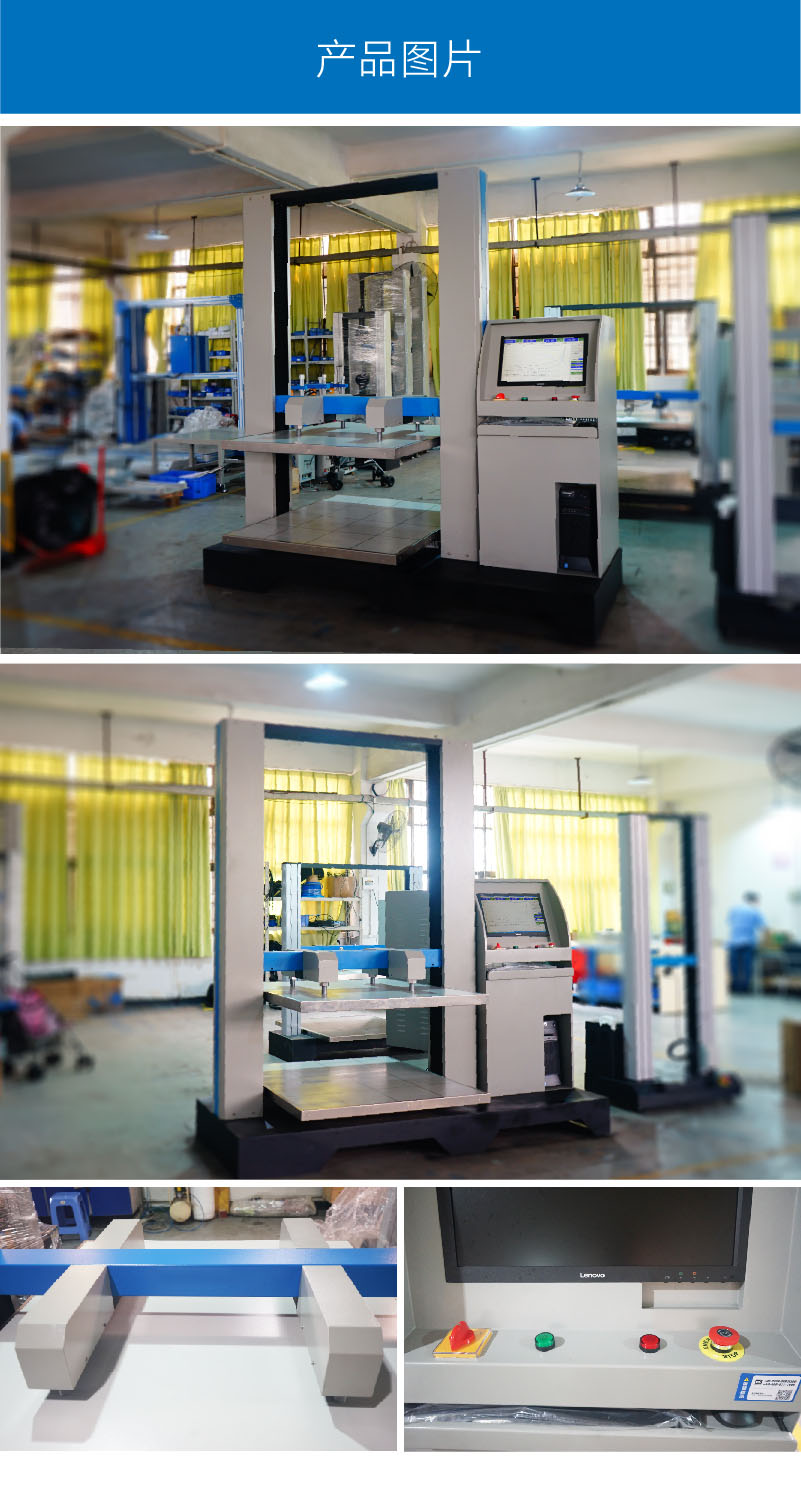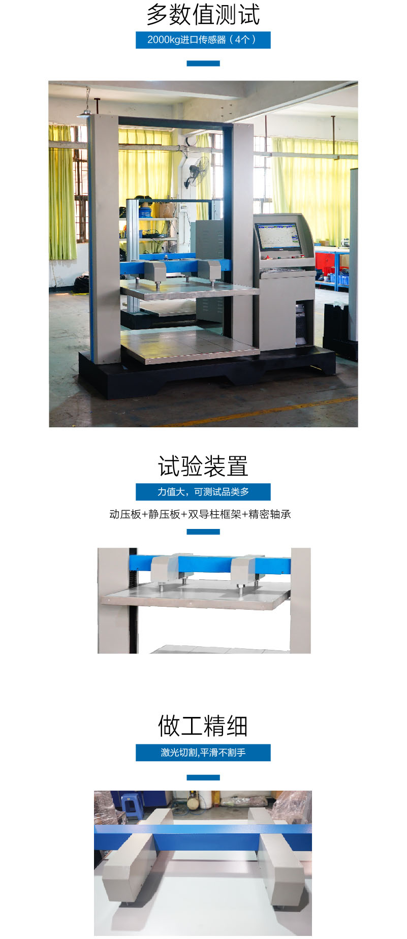 1) 容量選擇:4個1T懸臂梁進口傳感器; 2) 壓縮空間(L*W*H):1000 mm×1200 mm×1000mm; 3) 測試速度:(10±3)mm/min; 4) 荷重分解度:1/250,000; 5) 荷重精度:±0.25%以內; 16) 單位切換: kgf、Ibf、N 、KN、T等單位轉換; 6) 動力系統:松下伺服電機400W+松下伺服驅動器400W+臺灣利明SVB-11 1/50減速機+進口精密滾珠絲桿+同步傳送帶; 7) 控制方式:面板+電腦式采用TM2101先進電腦系統軟件控制,windows模式操作; 8) 力值控制:高精度傳感器+高速高精度AD轉換器+高速采樣; 9) 壓縮裝置:動壓板+靜壓板+保護限位推桿+導柱框架+軸承臺灣精密軸承; 10) 保護裝置:過載緊急停機裝置,上下行程限位裝置, 11) 外形尺寸(L*W*H):1795 mm×1200 mm×1820mm 12) 重量:約750kg; 13) 電源:1∮,220V,50Hz,10A; 紙箱抗壓試驗機規格一覽表產品型號壓縮空間容量選擇外形尺寸HD-A501-500非標400mm×500mm×550mm500kg、1000Kg800mm×610mm×1080mmHD-A502S-500非標400mm×500mm×550mm500kg、1000Kg800mm×610mm×1080mmHD-A501-900700mm×900mm×900mm1000Kg1250mm×800mm×1350mmHD-A501-12001000mm×1200mm×1000mm2000Kg1795mm×1200mm×1820mm HD-A501-15001300mm×1500mm×1500mm2000kg、5000Kg2100mm×1500mm×2320mm HD-A502-12001000mm×1200mm×1000mm2000Kg1795mm×1200mm×1820mm HD-A502S-12001000mm×1200mm×1000mm2000Kg1795mm×1200mm×1820mm HD-A502-15001300mm×1500mm×1500mm 2000kg、5000Kg2100mm×1500mm×2320mm HD-A502S-15001300mm×1500mm×1500mm 2000kg、5000Kg2000mm×1500mm×2320mm HD-A505S-12001000mm×1200mm×1000mm 2000Kg1795mm×1200mm×1820mm HD-A505S-15001300mm×1500 mm×1500mm2000kg、5000Kg2100mm×1500mm×2320mm | ||