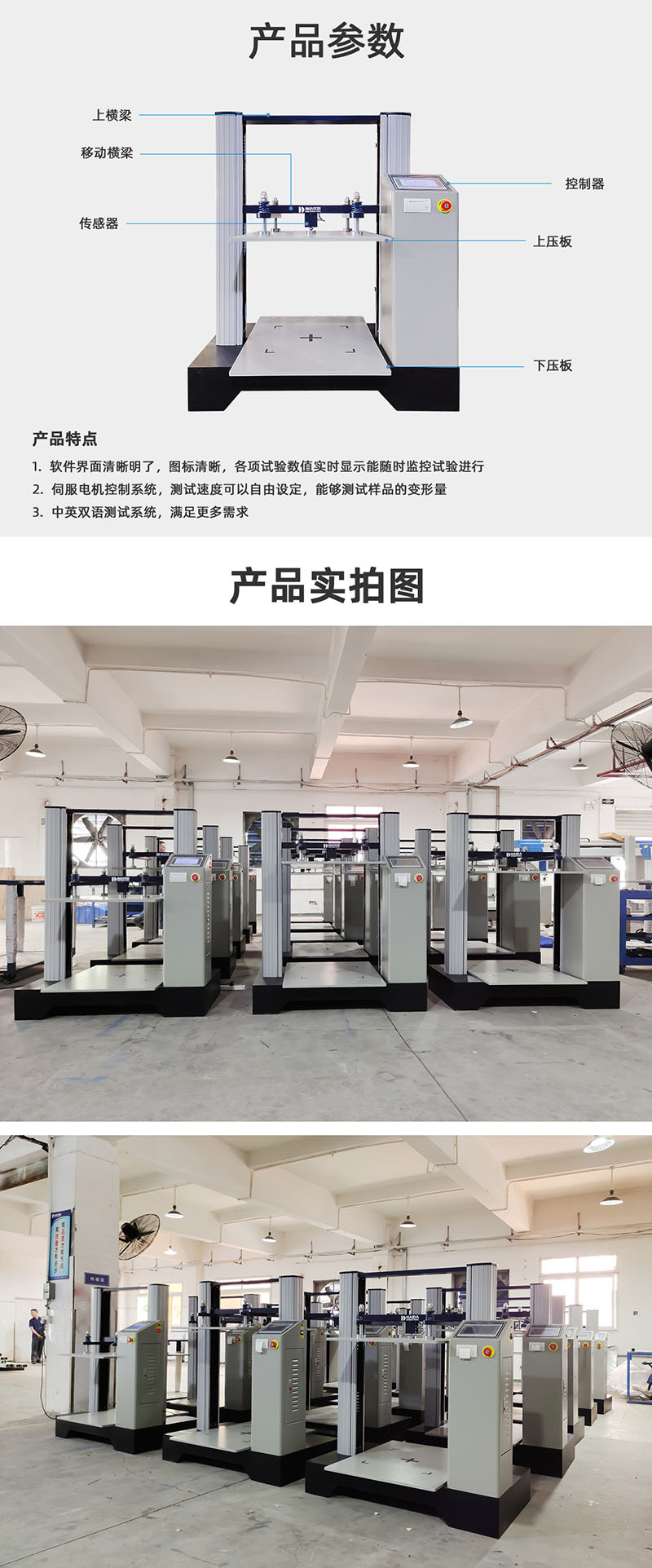 1.容量選擇10KN傳感器 2.測試空間約700mm×900mm×900mm(L*W*H) 3.壓縮行程0mm~900mm(H) 4.外形尺寸約1210mm×900mm×1425mm(L*W*H) 5.升降速度0.1~200mm/min 6.荷重分解度1/250,000 7.荷重精度≤±0.5% 8.電 機400W伺服電機 9.驅動器400W伺服驅動器 10.絲 桿滾珠絲桿 11.報表項目序號、峰值、平均值、設定持壓值、持壓時間 12.單位切換gf/kgf/N//kN/Ibf/T 13.報表輸出Windows模式輸出、Office模式輸出、熱敏打印機輸出 14.控制方式電腦控制,windows模式操作 觸摸屏控制 15.重 量約350kg 16.電 源1∮ AC 220V 17.整機功率約500W 18.主要測試項目紙箱抗壓試驗、紙箱堆碼試驗 | ||