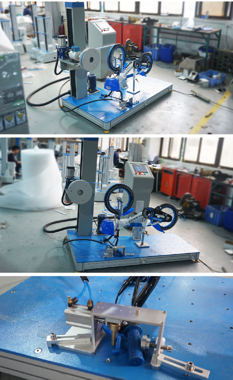 該設(shè)備用于測試手閘制動力,于驅(qū)動輪上纏繞一圈半帶子,在被測閘把末端25mm處施加一50~90N力,拉轉(zhuǎn)帶子轉(zhuǎn)動一圈半,當車輪的線速度達到0.5m/s至2m/s時,再拉轉(zhuǎn)一圈,記錄其平均制動力。對閘把取五個不同的力,每個力測試三個不同的讀數(shù),取平均值。 設(shè)計標準:GB14616 |
