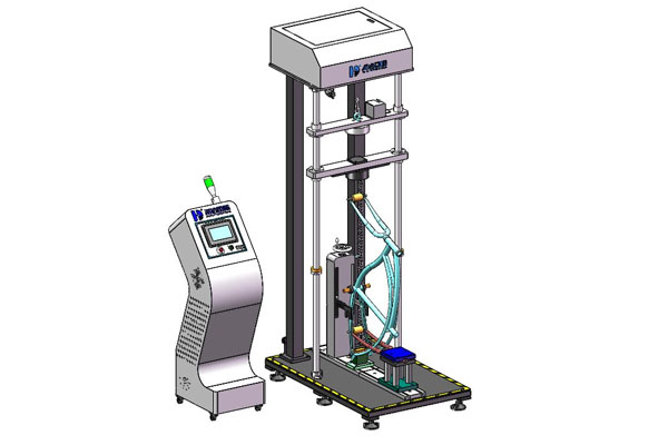 性能測試:將車架/前叉組件裝在后軸上,這樣可以使其能繞后軸在垂直平面內自由轉動;在前叉上面安裝上一只按照標準(GB3565標準里27.1項)制作的滾輪;調節車架中軸桿位置,使前叉滾輪與后軸垂直在同一直線上。使重錘輕觸滾輪,位移歸零。觸摸屏上輸入所需沖擊高度,點擊測試按鈕即可進行自動測試